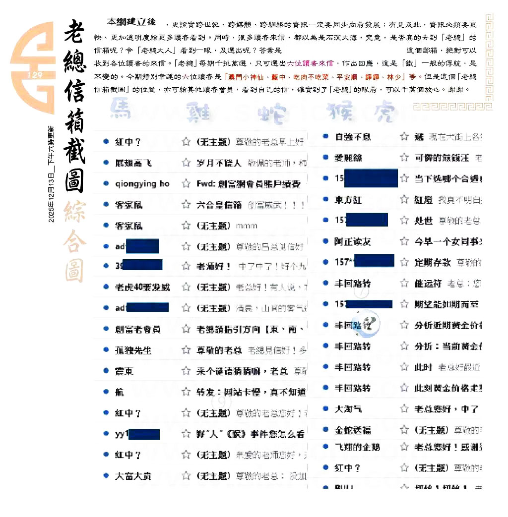 129期:六合皇金句/老总论码/萧公子/林大师/五行夺码/老总信箱截图 |